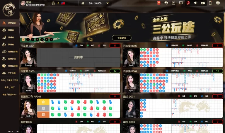 | 遊戲種類 | 百家樂、牛牛、骰寶、輪盤、龍虎、博丁、三公、炸金花、剪刀石頭布 |
