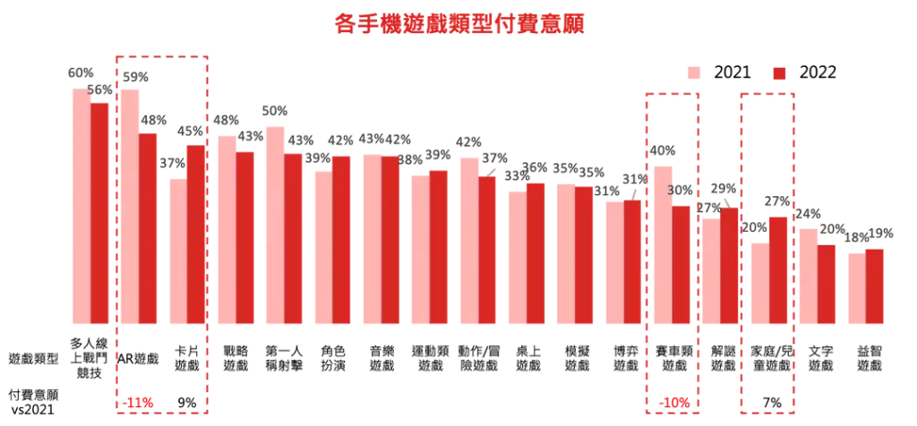 詢問受訪者關於付費意願時,台灣玩家表示最願意為多人線上戰鬥競技遊戲課金佔56%,願意為AR遊戲付錢的有48%,卡片遊戲則有45%。