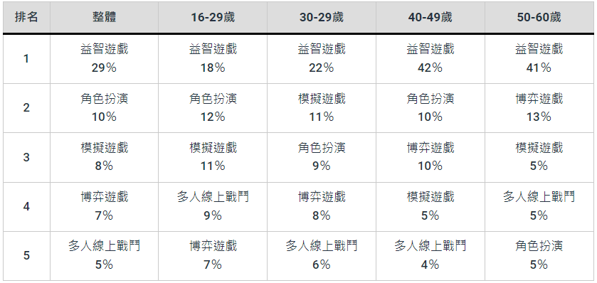 各年齡層最喜歡的遊戲類型