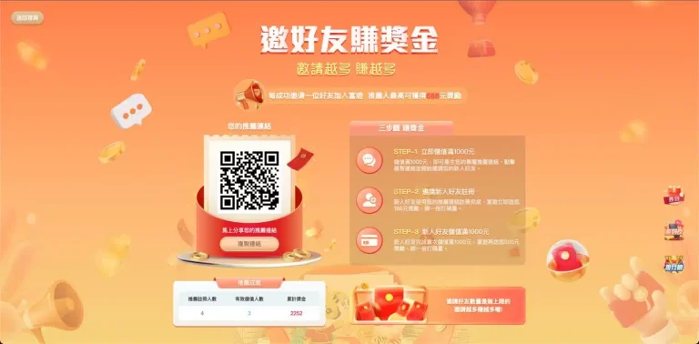 - 推薦好友禮金頁面都有提供推薦註冊人數、推薦儲值人數、累計推薦獎金,頁面都有清楚幫您紀錄。