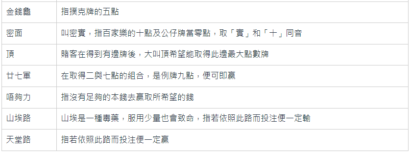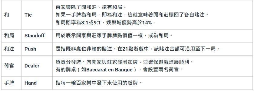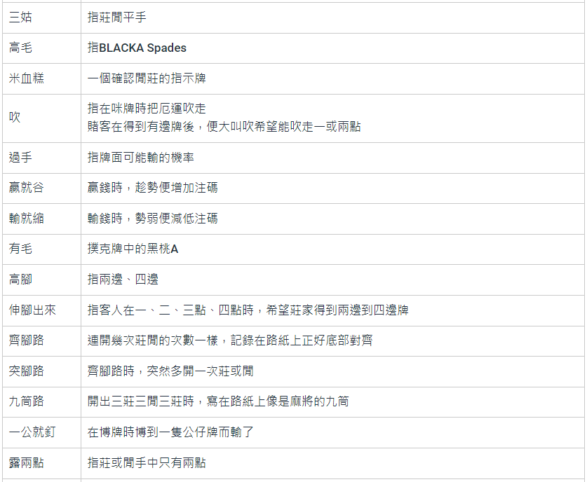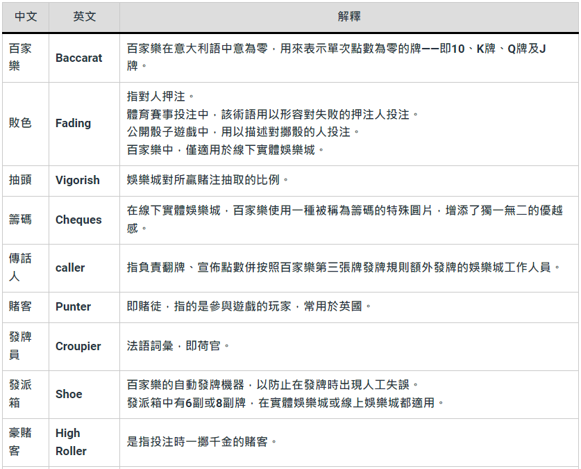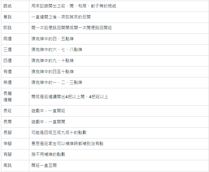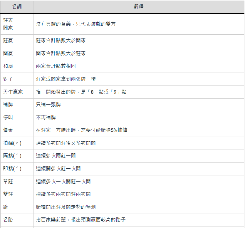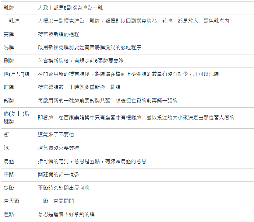 百家樂術語專業名詞解釋