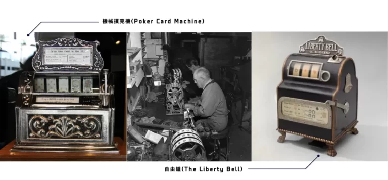 角子老虎機的起源,位於紐約布魯克林Sittman&Pitt公司,在1891年對外發布的首台機械撲克機,這款機器以撲克牌遊戲為基礎,機器使用比現在5軸(Reel)老虎機再大一些的鼓輪(Drum),每個鼓輪上夾了10張紙牌,一共50張。 - 自由鍾(The Liberty Bell) :